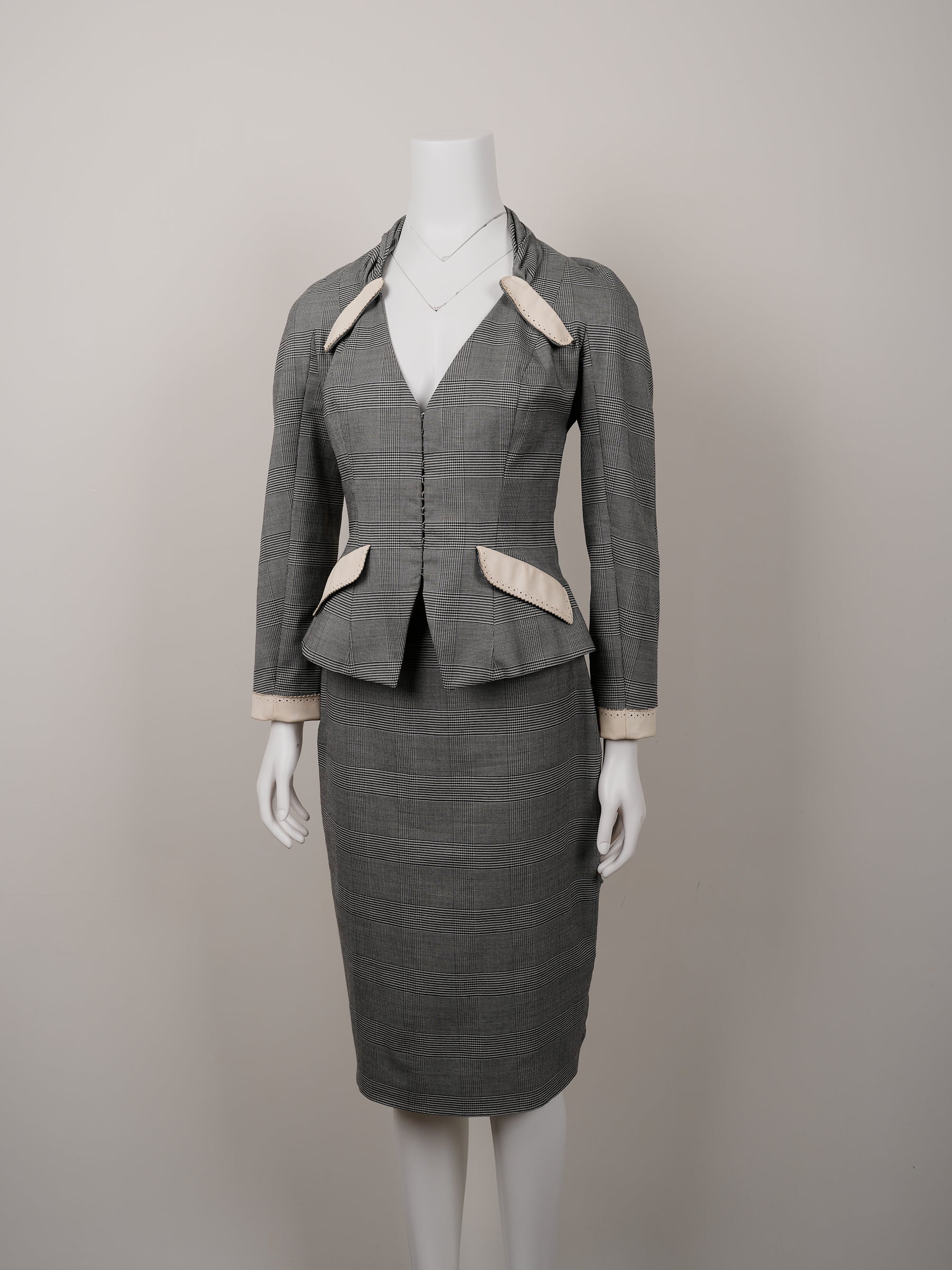 Christian Dior by John Galliano Fall/Winter 1998 Grey Wool Tweed Skirt Suit with White Calais Lace