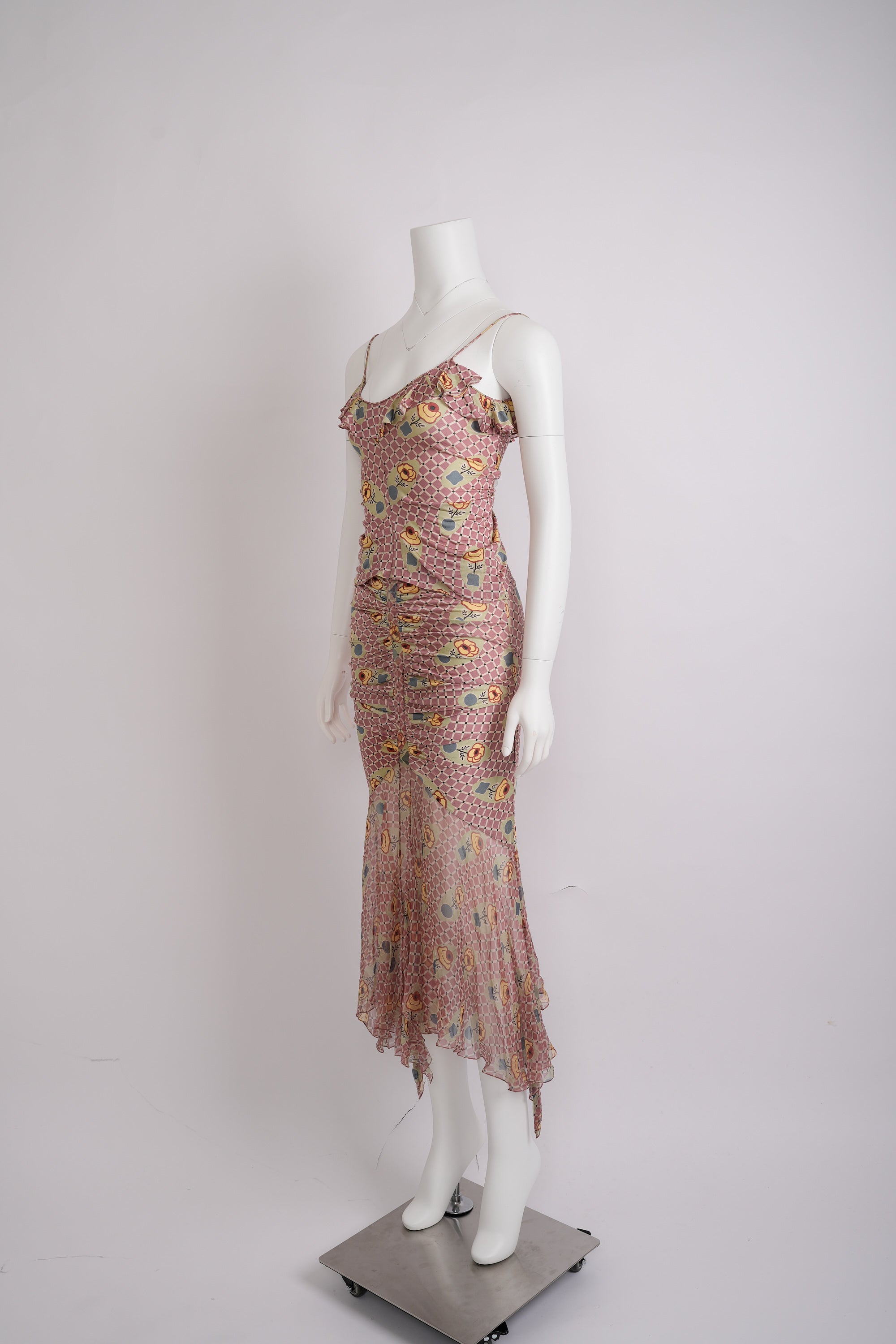 Preowned Christian Dior by John Galliano SS 2003 Abstract Floral Chiffon Dress Draped Frill & Self-Covered Buttons